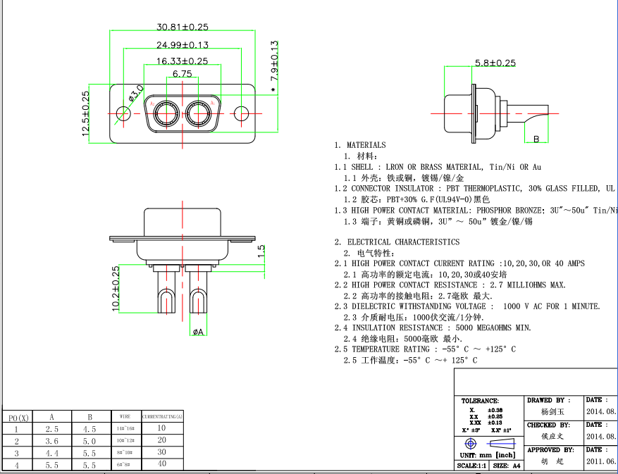 D型 2芯 30A 矩形航空插頭,參照GJB142A標準,該類產品型號種類多,有大電流,有混裝大小電流的,客戶可根據實際情況選用,具體介紹如下: