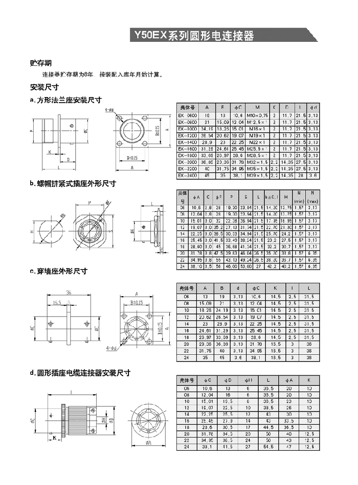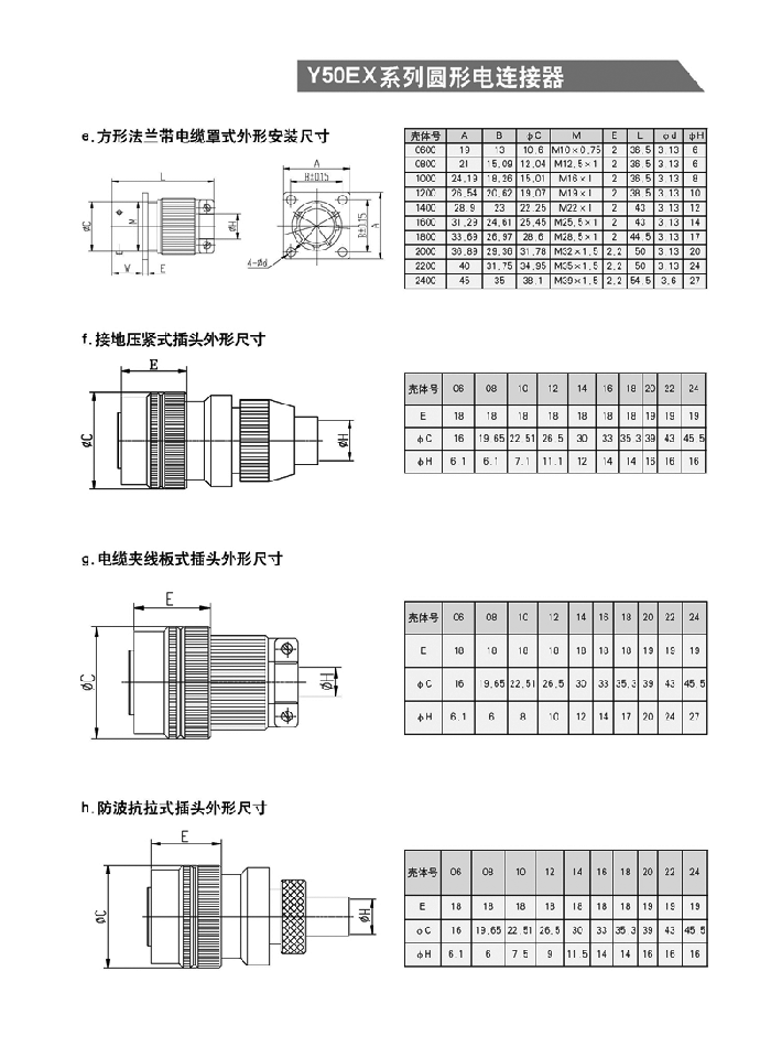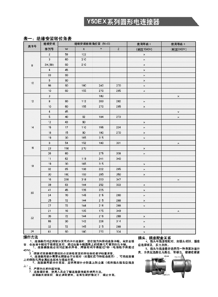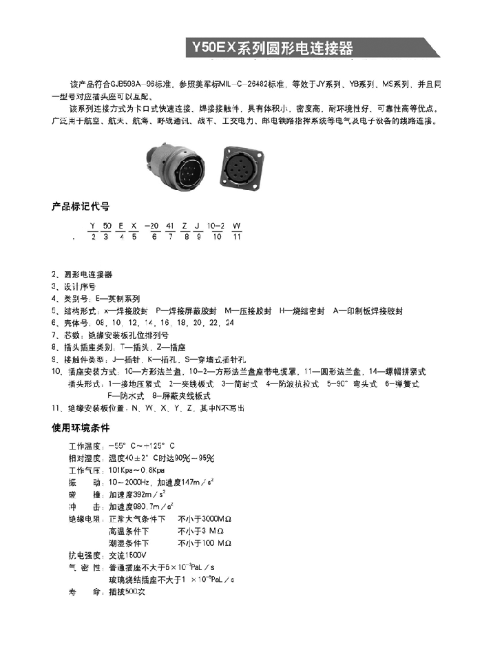 Y50EX系列圓形航空頭采用卡口式連接系統(tǒng),具有快速控接和快速分離,體積小、重量輕等特點(diǎn)。插頭有多種電纜安裝形式,即:電纜夾線板式、簡(jiǎn)易封裝式、接地壓緊式、防波抗拉式、彎頭護(hù)線式、電纜話筒式和彈簧護(hù)線式等。電纜出線口備有各種規(guī)格不同的密封橡膠護(hù)線縣,能與電纜線緊密配接,增強(qiáng)了電纜線和連接器插頭的防雨、防水、防塵密封性和抗拉性能。接觸件焊接,殼體有屏蔽和非屏蔽以及多種鍍層可選,插座有一般密封和玻璃燒結(jié)密封等類觀,以適用不同的工作環(huán)境。適用于戰(zhàn)略戰(zhàn)術(shù)系統(tǒng),電子對(duì)抗系統(tǒng),野外作業(yè)電能,通訊信號(hào)連接系統(tǒng),航大航空航海通訊和測(cè)試跟蹤系統(tǒng),計(jì)算機(jī)系統(tǒng)、郵電鐵路指揮系統(tǒng),進(jìn)口醫(yī)療儀器設(shè)備等電能、電訊信號(hào)的近接。