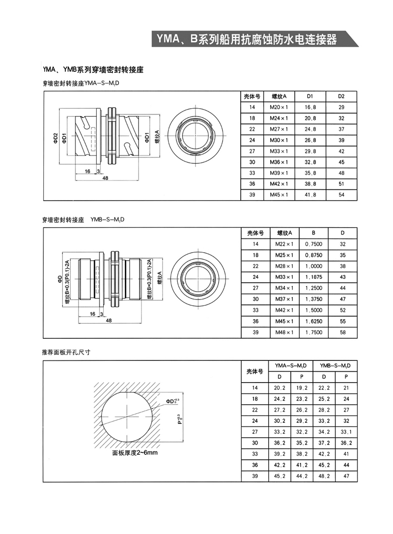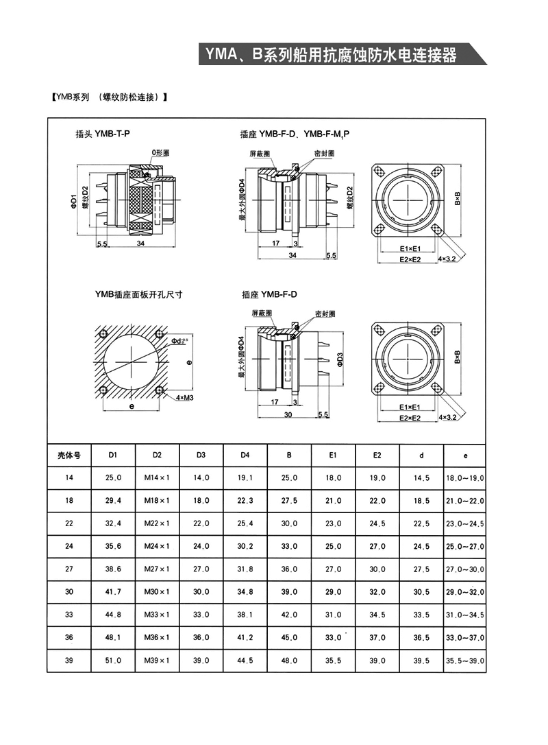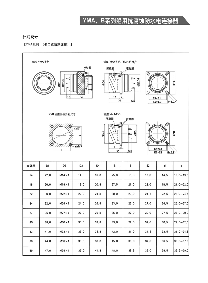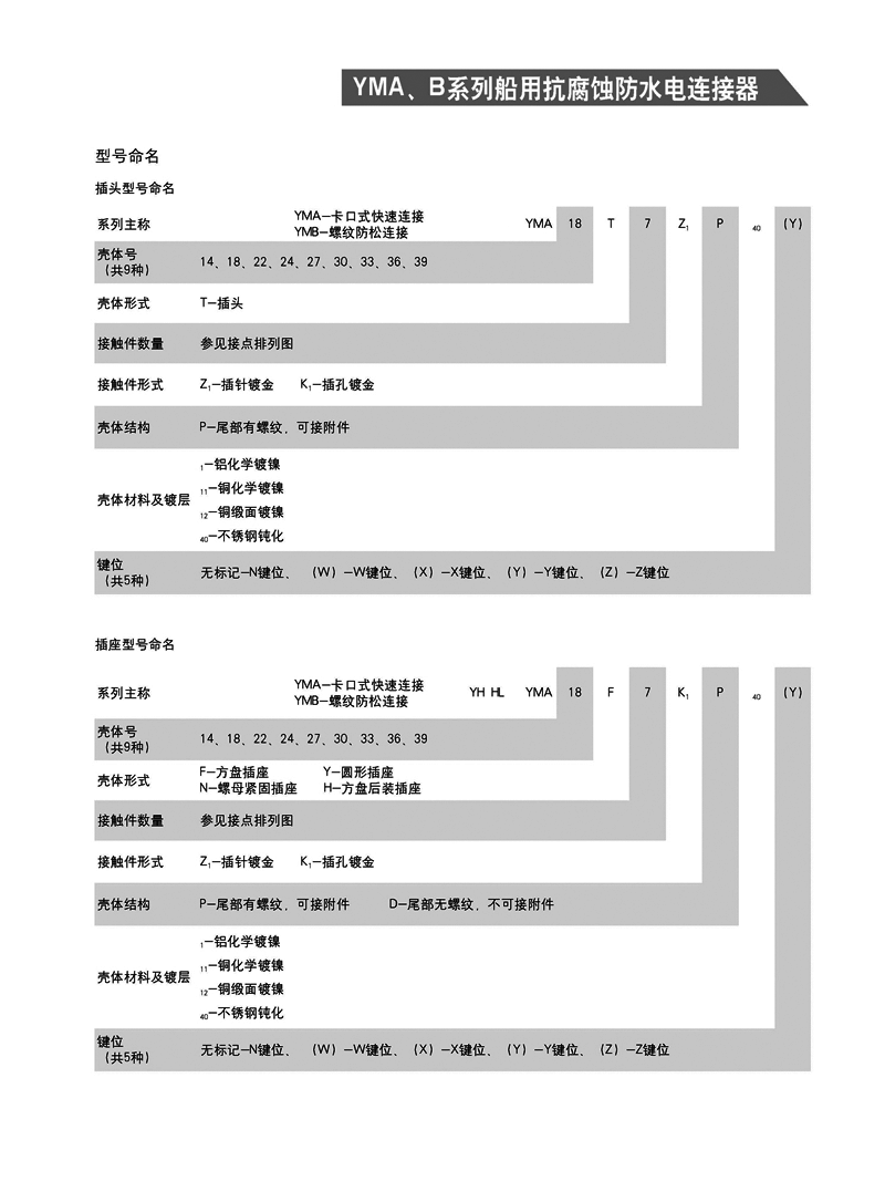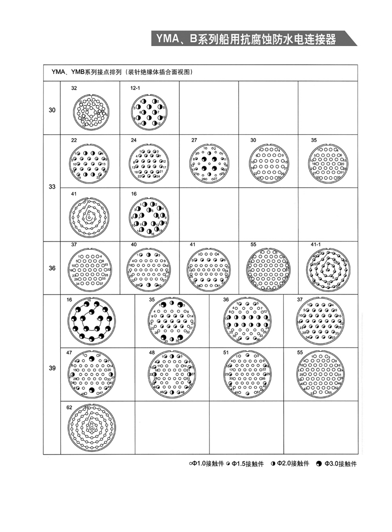 YMA YMB圓形防水防腐航空插頭,適用于濕熱、浸水等惡劣環(huán)境,可耐50米水深密封,耐1000小時鹽霧試驗(yàn):YMA系列為卡口式快速連接,YMB系列為螺紋防松連接,頭座均為焊接。 YMA、YMB系列船用抗腐蝕防水電連接器 1.【概 述】 * YMA系列—— 卡口式快速連接 * YMB系列—— 螺紋防松連接 * 適用于潮濕、浸水等惡劣環(huán)境下的設(shè)備與電纜、電纜與電 纜之間的電氣連接 * 可耐50米水深密封 * 插頭插座端接方式均為焊接 * 五鍵定位具有盲插和防錯插功能 * 高可靠的雙曲面線簧插孔使連接器插拔柔和,接觸電阻小 * 插頭、插座既可裝針,也可裝孔 http://www.bhcyw.cn/Product/yuanxinghangkongchatouhangkongjiechajian/