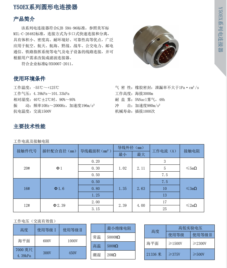 Y50EX系列圓形電連接器符合GJB598A-96標準,同時滿足MIL-DTL-26482H質量標準,卡口是快速連接,雙重鎖緊結構,