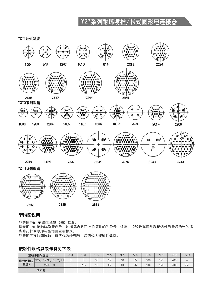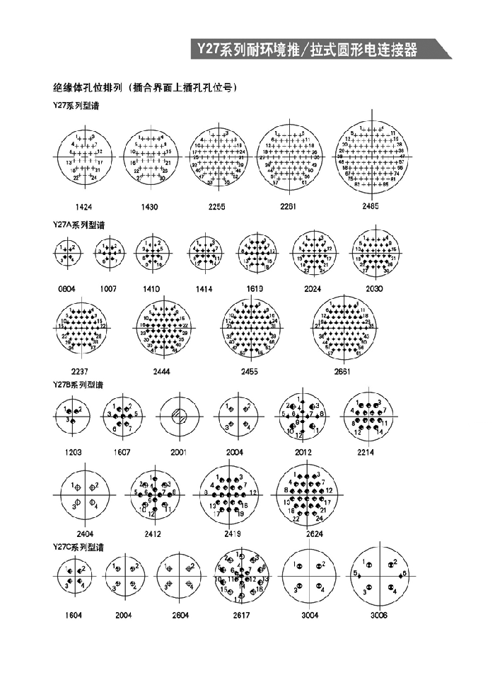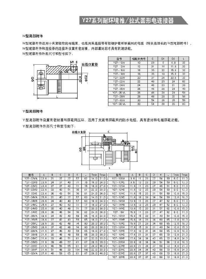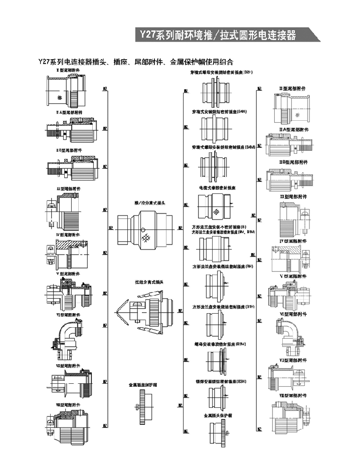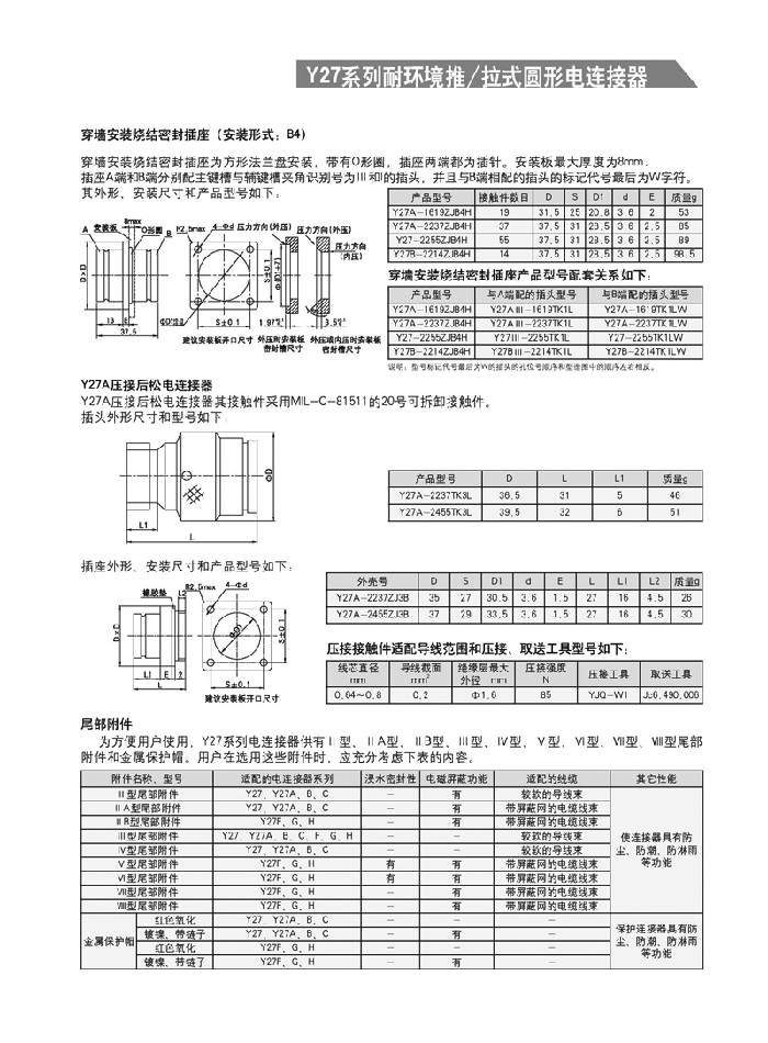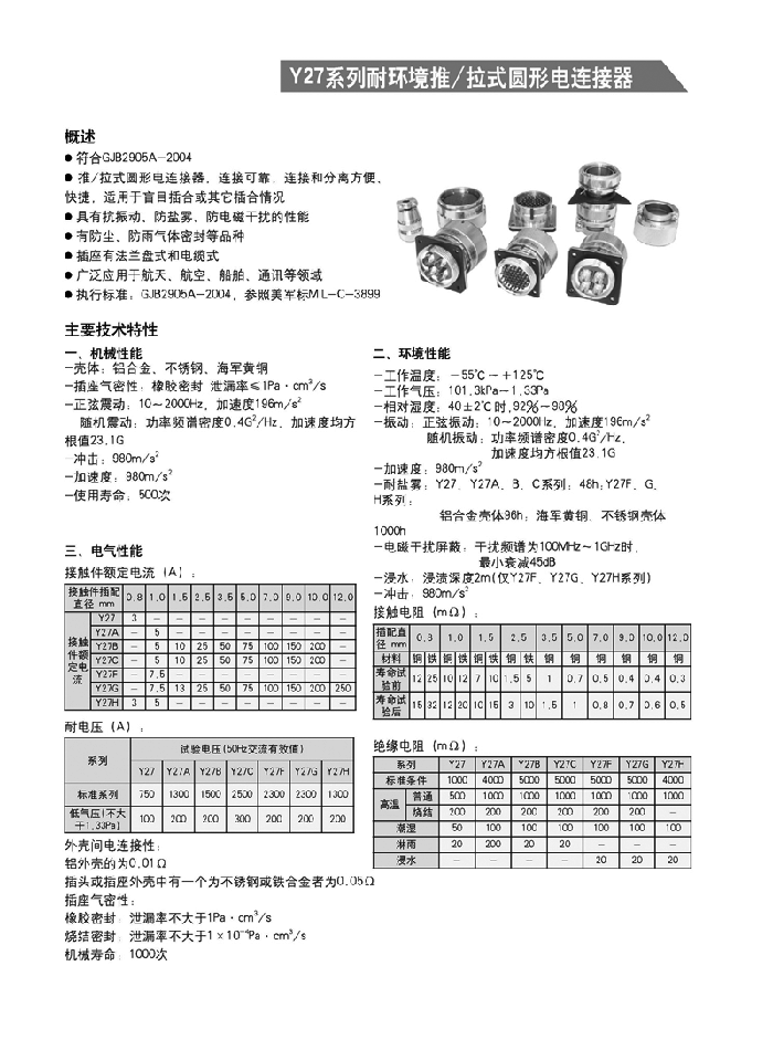 Y27系列耐環境推/拉式圓形航空插頭 ,采用推/拉式鎖緊機構,材料為鋁合金、海軍黃銅和不銹鋼三種,共有13種殼體號,1~121等18種芯數,有3~250A等10種電流規格。Y27A系列電連接器有壓接后松的品種。Y27F、G、H系列電連接器適用于艦船環境,具有防水密封的性能。Y27H系列電連接器采用雙曲線插孔。符合國家軍用標準GJB2905-97,性能參照美軍標MIL-C-38999。 該系列航空插頭連接和分離方便、快捷,適用于盲目插合或其他插合情況,具有抗振動、防鹽霧、防電磁干擾的性能,有防塵、防雨及氣體密封等品種。Y27系列電連接器廣泛應用于航天、航空、船舶、通訊等領域。