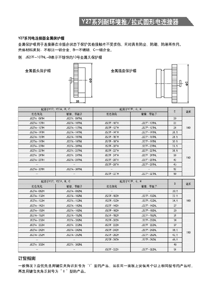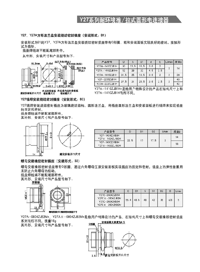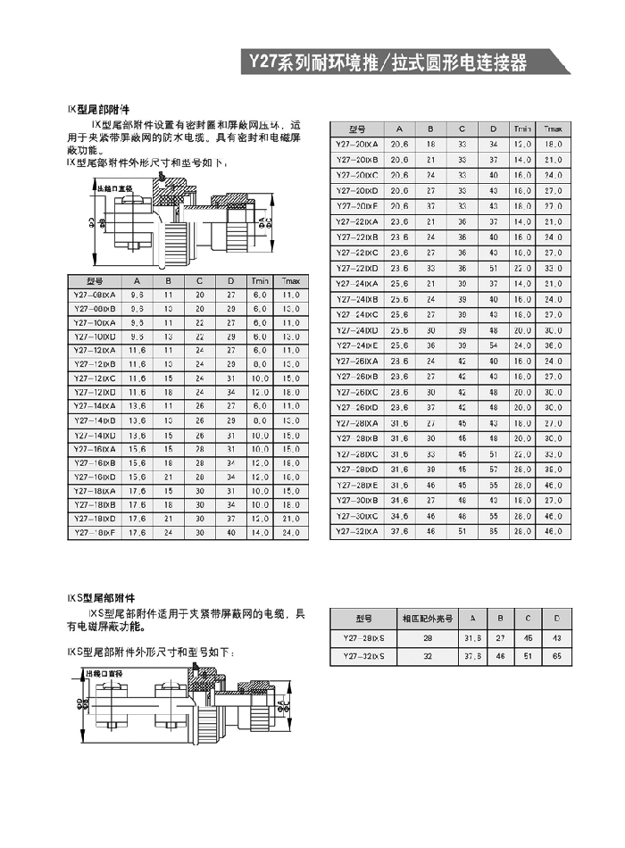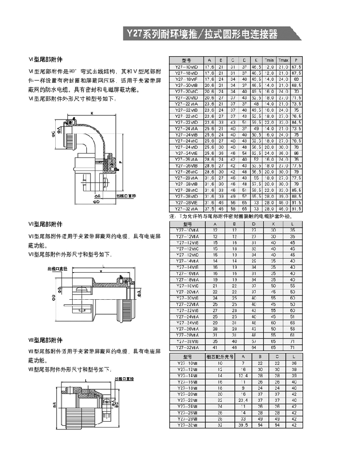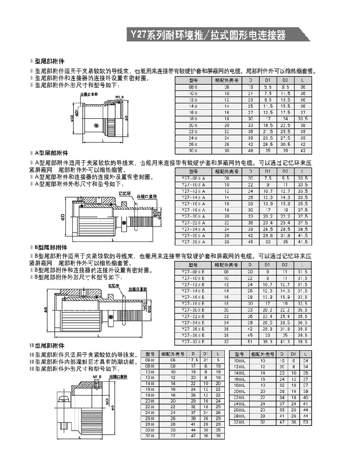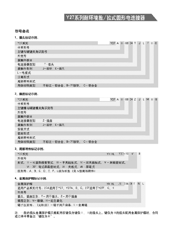 Y27系列耐環境推/拉式圓形航空插頭 ,采用推/拉式鎖緊機構,材料為鋁合金、海軍黃銅和不銹鋼三種,共有13種殼體號,1~121等18種芯數,有3~250A等10種電流規格。Y27A系列電連接器有壓接后松的品種。Y27F、G、H系列電連接器適用于艦船環境,具有防水密封的性能。Y27H系列電連接器采用雙曲線插孔。符合國家軍用標準GJB2905-97,性能參照美軍標MIL-C-38999。 該系列航空插頭連接和分離方便、快捷,適用于盲目插合或其他插合情況,具有抗振動、防鹽霧、防電磁干擾的性能,有防塵、防雨及氣體密封等品種。Y27系列電連接器廣泛應用于航天、航空、船舶、通訊等領域。