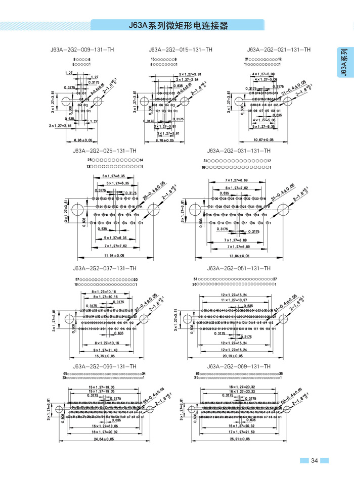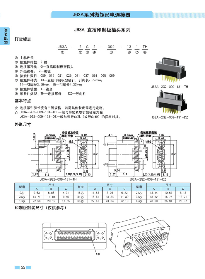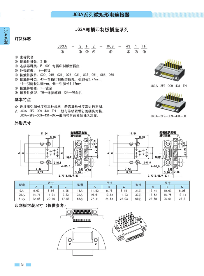 J63A 型90°彎插印制板航空連接器,端接方式是印制板,而且是90°彎腳,座殼體與墻體正常安裝,印制板平行放置,與插針直接焊接。要說明的是印制板可以立著放,這時選用直式插針焊接。以下是選購圖: