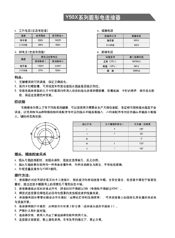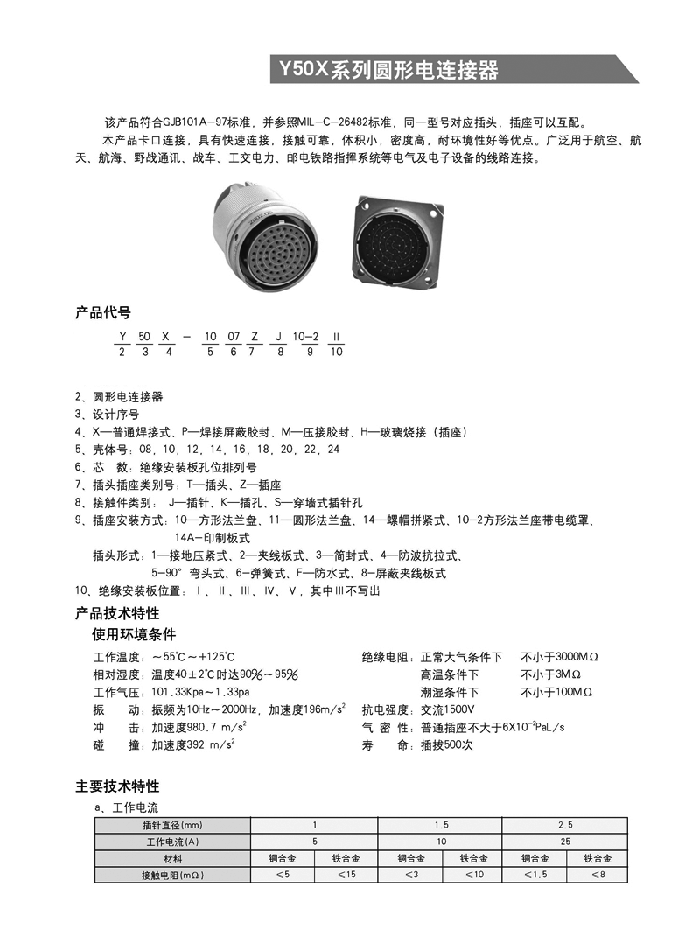 Y50系列航空插頭包括公制、英制、電源三大類電連接器。均為內螺旋槽卡銷鎖緊式。具有快捷連接與分離,體積小、重量輕,密封性能好,抗拉性能優之特點。插頭電纜罩有七種安裝方式,殼體分屏蔽與非屏蔽,電纜引出有直式和彎式,端接方式為焊接式。品種多,規格全。Y50X是公制航空插頭,相對體積要大些。而且該產品可根據用戶需求改裝成濾波連接器,真空氣密封連接器。 均參照GJB101A—97,GJB598A—96,MIL—C—26482等標準的要求。適用于戰略、戰術系統,野外作業等電訊號、電能的連接。