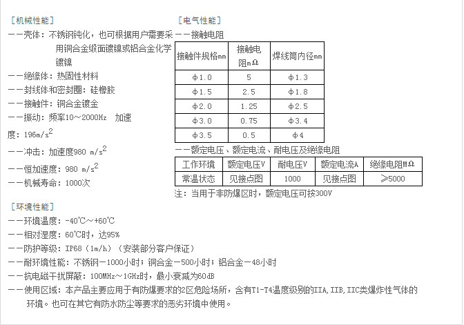 EX增安型防爆接插件,我公司先開發了4芯,8芯,12芯,15芯,32芯。有低電流,有高電流,插座有對接式,固定式。采用緊湊型 結構設計,EXPlora系列系列防爆連接器一旦鎖緊環收緊后可達IP68等級的環境密封,不需要任何的補充密封。當連接器沒有匹配使用時; 可以用帶高強度鋼絲繩的密封帽同樣可以達IP68等級。 螺母固定的接線端子可使用的導線最大達4mm2, 不需要任何特殊的工具進行安裝和拆卸。位置鍵槽可以防止錯誤的連接。線纜固定夾以及可替換的密封線纜圈的兩種設計可接受7mm-22mm直徑的線纜。 主要用在各種需要一個安全,可靠,容易分斷的連接的應用。尤其是在易爆燃性氣體可能存在的制造廠的機器設備以及系統供電場合; 也用在石油化工行業;包括磨坊,糧倉,油漆或油墨廠家,木材加工廠,水泥廠,船務和污水處理。 Bulgin(包錦)這款防爆連接器也適用于外部電器設備,如馬達,泵,燈光設備,過程控制裝置用在危險的廠家和工廠,或導致易燃 氣體,蒸汽,薄霧氣體或易燃塵埃的爆炸環境。 |