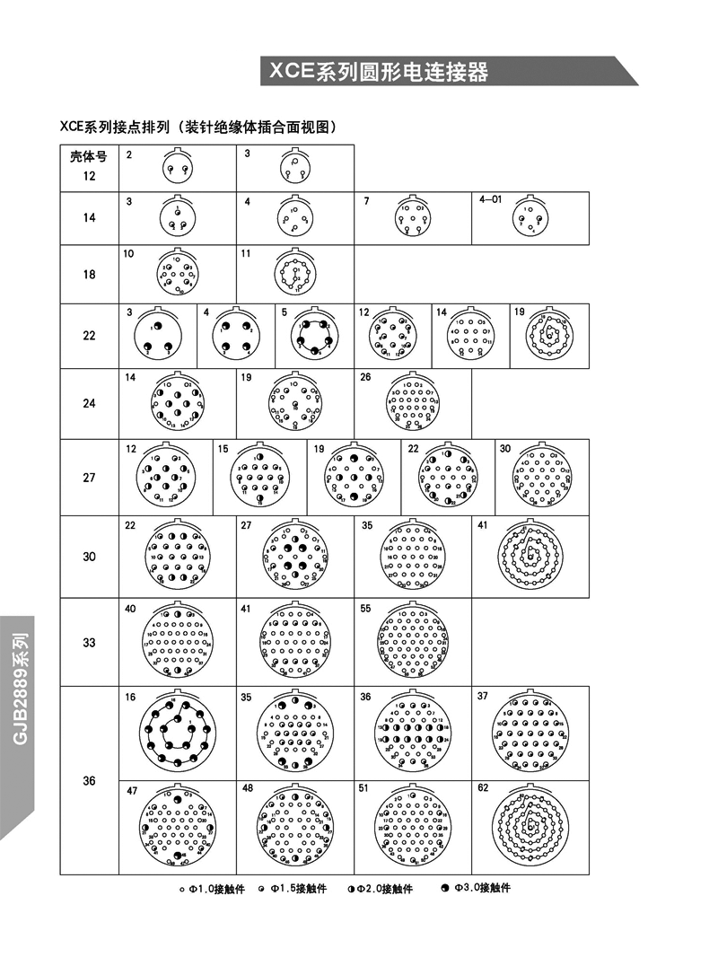 XCE系列軍用圓形電連接器,是在XC型譜排列基礎上,壓縮接點排列孔位間距,在相同接觸對數下比XC體積小,重量輕,殼體為高強度鋁合金材料,插頭、插座既可裝針也可裝孔,其連接方式為卡口式快速連接和分離,操作方便,連接可靠,抗振耐沖,接觸件有焊接式,其中插孔為線簧孔,具有插拔柔和、接觸電阻小、防潮、防鹽霧、防霉菌、防淋雨等特性,主要應用于艦船等各種惡劣環境領域,也可應用于航空、航天、兵器、野戰通信等軍事領域以及郵電通訊、鐵路指揮系統、計算機、航海和各種儀器、儀表的線路連接。