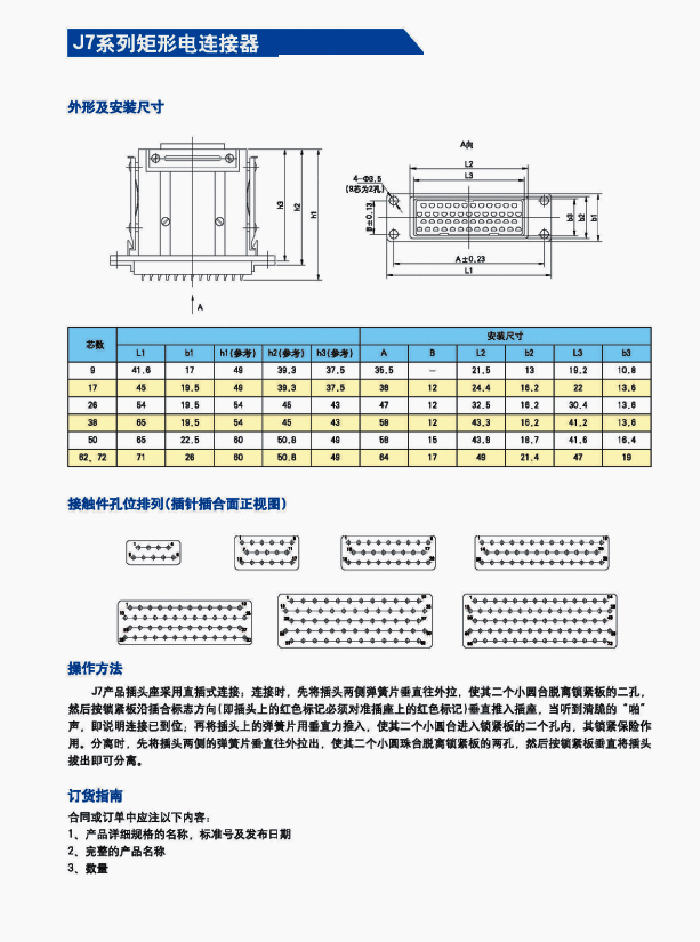 J7系列矩形航空插頭,認證采用的國家標準為GJB 176-86《耐環境線簧孔矩形電連接器總規范》。連接方式為直插連接,使用方便,可快速插拔。帶有獨特的雙重鎖緊機構,防雨,外殼屏幕,插座灌膠密封, 密封性(僅密封插座)耐氣壓0.2Mpa。體積小,重量輕。插孔采用高可靠性能插孔,插拔力小,使用壽命長。 J7系列矩形電連接器適用于各種電子儀器、電氣設備系統之間的電路連接。