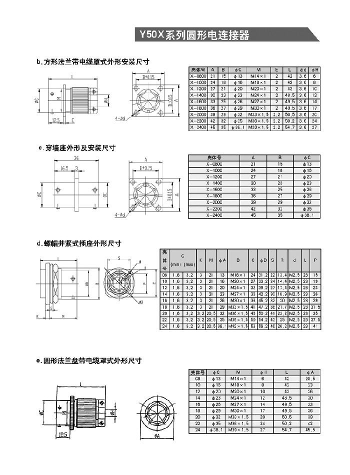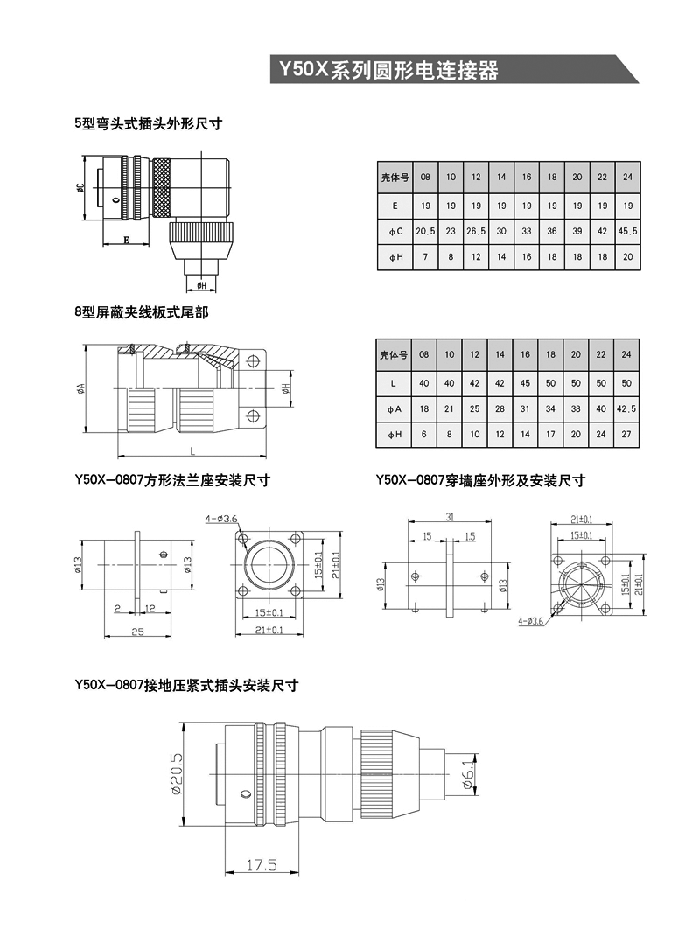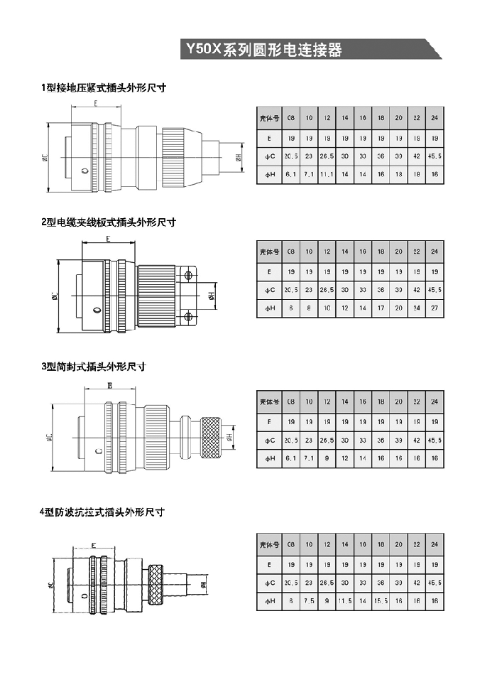 Y50系列圓形航空插頭包括公制、英制、電源三大類電連接器。均為內(nèi)螺旋槽卡銷鎖緊式。具有快捷連接與分離,體積小、重量輕,密封性能好,抗拉性能優(yōu)之特點。插頭電纜罩有七種安裝方式,殼體分屏蔽與非屏蔽,電纜引出有直式和彎式,端接方式為焊接式。品種多,規(guī)格全。Y50X是公制航空插頭,相對體積要大些。而且該產(chǎn)品可根據(jù)用戶需求改裝成濾波連接器,真空氣密封連接器。 均參照GJB101A—97,GJB598A—96,MIL—C—26482等標(biāo)準(zhǔn)的要求。適用于戰(zhàn)略、戰(zhàn)術(shù)系統(tǒng),野外作業(yè)等電訊號、電能的連接。