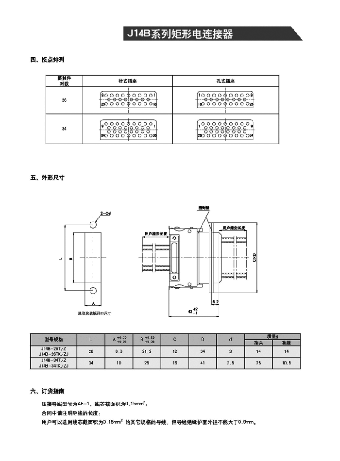 在J14A系列連接器外殼的基礎上,增加了接觸件的密度和防雨功能。帶電纜,端接形式為壓接,電纜規格和長度由用戶確定。