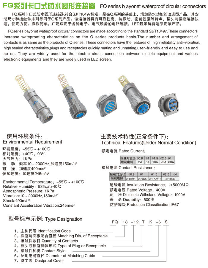 FQ 系列防水圓形電連接器符合電子工業部元器件工業管理局局標準DZ4Q/RE008-84制造,產品結構先進,可靠性高,插孔接觸采用高可靠的鼠籠式彈性接觸代替傳統的線簧結構,產品具有接觸電阻小、抗振動、耐沖擊、密封性強等特點,插頭座連接為卡口式快速連接,使用簡單,操作方便,被廣泛應用于各種電子設備間的電氣連接。