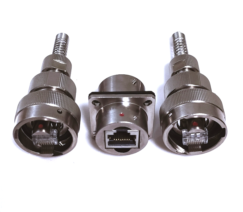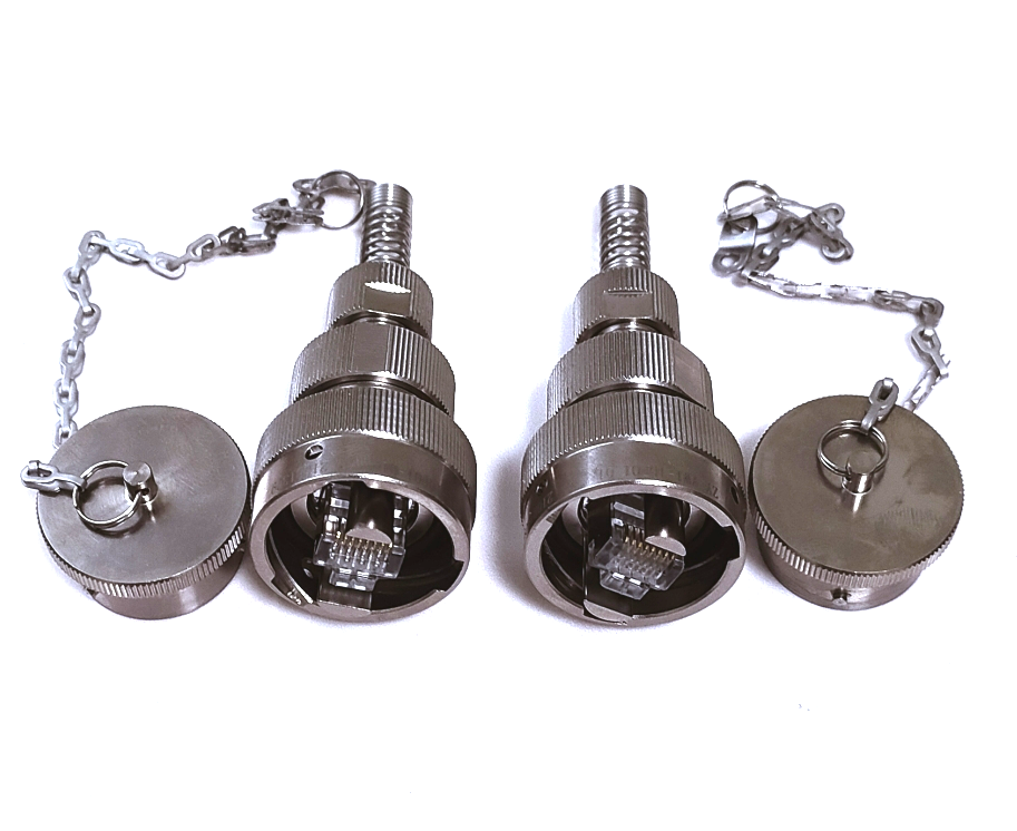 RJ45網口太網防爆連接器,外殼全金屬材料,有鋁合金和不銹鋼選用。不用的時候,有專用的防塵蓋,插座和插頭連接后